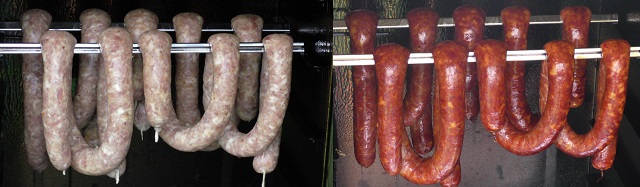 Następny etap – po stwierdzeniu , że kolor kiełbasy jest prawie prawie dobry to należy przerwać dymienie lub dym mocno rozrzedzić i podnieść temperaturę do 80 st. C na kolejną – ostatnią godzinę. Po tym czasie wędzarnię wygasić i pozostawić kiełbaski w środku od powolnego wystudzenia.