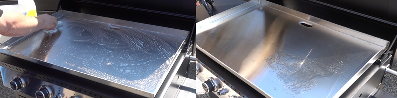 Griddle to grill z płaską płytą. Zaczynałem od umycia tej płyty i rozgrzania jej. Ma być bardzo gorąca, co najmniej 190 stopni. Na gorąco przecieram ją jeszcze raz wilgotną ściereczką, a potem ten fragment powierzchni na który będę wykładał produkty lekko zwijam rafinowaną oliwą. Akurat taką, bo ma wysoką temperaturę dymienia.