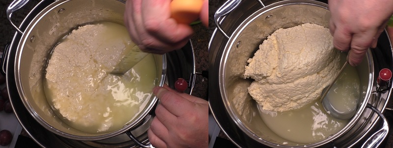 - Po tym czasie można będzie zauważyć, że pokrojone elementy sera zaczynają się łączyć i zwiększają swoją objętość. Tak będzie się działo podczas dalszych czynności. Jednocześnie będzie widać, że serwatki przybywa, więc za każdym razem należy ją odbierać. Teraz trzeba obrócić bryłę sera na inny bok niż ten, na którym do tej pory w garnku spoczywała. Jeżeli elementy sera połączyły się dość wyraźnie, może to być dowolny inny bok bryły, ale jeżeli połącznie jest niepewnie – bryłę należy po prostu odwrócić na bok przeciwległy i pozostawić tak na kolejne 10 minut.