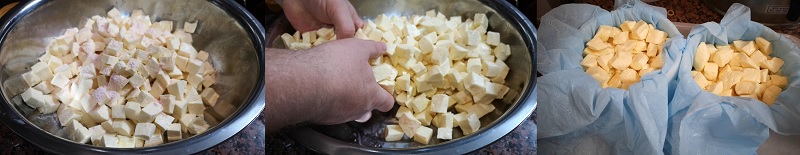 Teraz zaczyna się bardzo ważny etap wyrobu domowego Cheddara – cheddaryzacja, czyli jednoczesne obniżanie pH sera, spulchnianie i scalanie jego struktury. Dzieje się to tak: