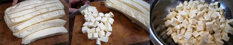 Koniec cheedaryzacji. Wyjąć bryłę sera z gara, pokroić go w plastry, a następnie w kostkę o boku około 1 cm. Będzie ona tworzyła charakterystyczną dla tego sera strukturę, dostrzegalną także w wyrobie gotowym. Pokrojony w kostkę ser włożyć do miski, rozsypać na niego 1 łyżkę stołową soli kuchennej i wymieszać zawartość, żeby sól równomiernie rozprowadzić, a następnie powtórzyć czynności, dodając drugą i następnie kolejną łyżkę soli. Po wymieszaniu ser jest gotowy do umieszczenia w formie i prasowania. Na tym etapie ser ma już przyjemny smak świeżego sera i można, a nawet trzeba go spróbować.