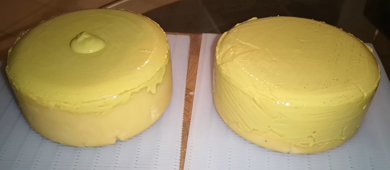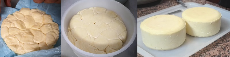 To kończy etap prasowania. Można jeszcze opcjonalnie obrócić ser w formie, tym razem już bez chusty – i prasować go przez 1-2 godziny w celu zlikwidowania zagnieceń na powierzchni, które po chuście pozostały.