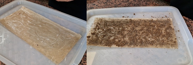 Dalej można postępować na dwa sposoby, czyli można najpierw rozsypać na posmarowany papier samą cebulkę, a dopiero potem jako drugą warstwę posypać pieprzem – ale można również oba składniki zmieszać razem i dopiero potem rozprowadzić na papierze. Jeżeli by się okazało, że przypraw było za mało i nie rozprowadziły się równomiernie po formatce papieru to można to uzupełnić dodatkowo ilością pieprzu mielonego lub tłuczonego. Warstwa przypraw powinna być jednolita i niezbyt cienka.