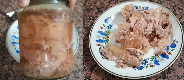 Uda indycze to świetny materiał na taką konserwę w słoiku. Trzykrotna pasteryzacja zapewni dobre zabezpieczanie i długa trwałość. Taka słoikówka jest znakomita do jedzenia na zimno oraz na gorąco jako mięsny składnik dania. Duże kawałki mięsa i zespalająca je pyszna galaretka. Zacnie to wygląda i smakuje.